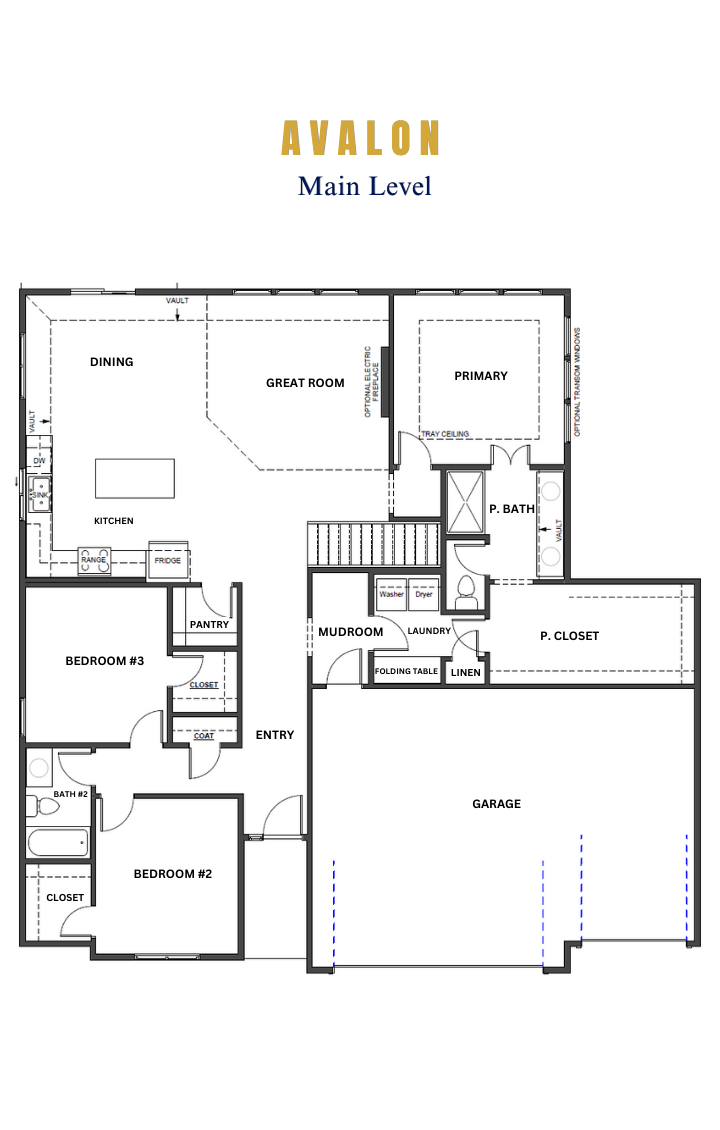 Introducing “Avalon,” where the timeless appeal of main-level living meets modern comfort and convenience. This 3-bedroom, 2-bath floorplan boasts an expansive open living concept, with a spacious living room, dining area, and kitchen with vaulted ceilings and ample natural light. Retreat to the generous primary bedroom suite, complete with a large closet for all your storage needs. Elevate your lifestyle with the option to expand your living space further with an optional lower-level finish, creating the perfect sanctuary to call home.